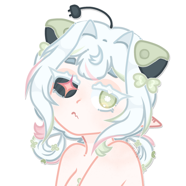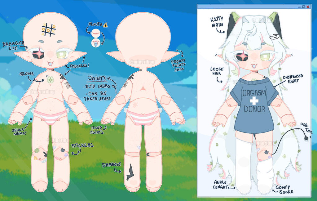 (see reference sheet for more notes).- Outfit change is OK, she likes comfy clothing but ultimately will wear anything. Like a doll!- Her chest size is strictly small/medium, NOT FLAT. Please don't give her huge knockers.- Please do not forget any of the details listed on the reference sheet. Damage and tear is optional but preferred.- Do not give her a regular right (right for her, left for front facing viewer) eye unless it's her un-awakened state OR specifically requested by me.- Have fun with glitches, computer elements and electronics. She is charged via her ahoge port.- I'd love it if you shared your fan art with the tag #bugallery on social media!