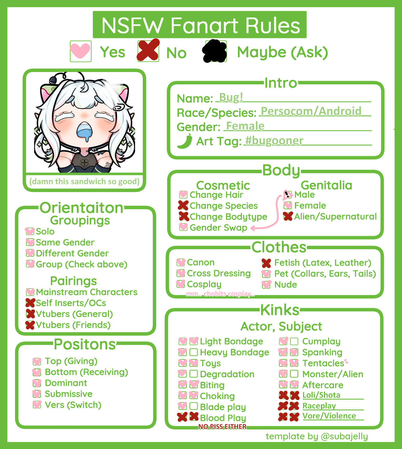 (See NSFW Guidelines below for more info)- Mild gore is okay, but please keep in mind she is a robot and does not have human organs.- Remember her "blood" is blue, this applies to her mouth but NOT to her genitals. (no blue coochie, sorry gang 💔)- Please refrain from depicting her doing anything illegal or distasteful.- Preference for smug/cheerful expressions, unless it's her unawakened state